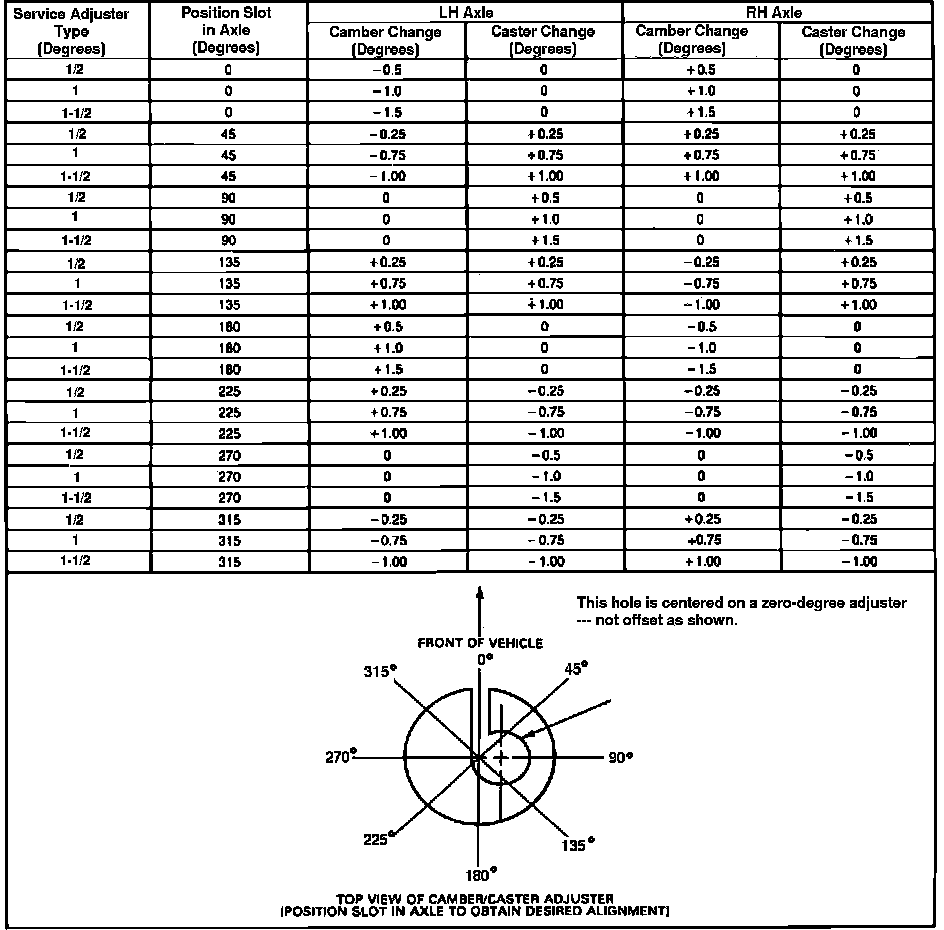 Caster and camber adjustment is possible with adjusters available in 1/2°, 1° and 1-1/2° increments. One adjuster is used to adjust both caster and camber.