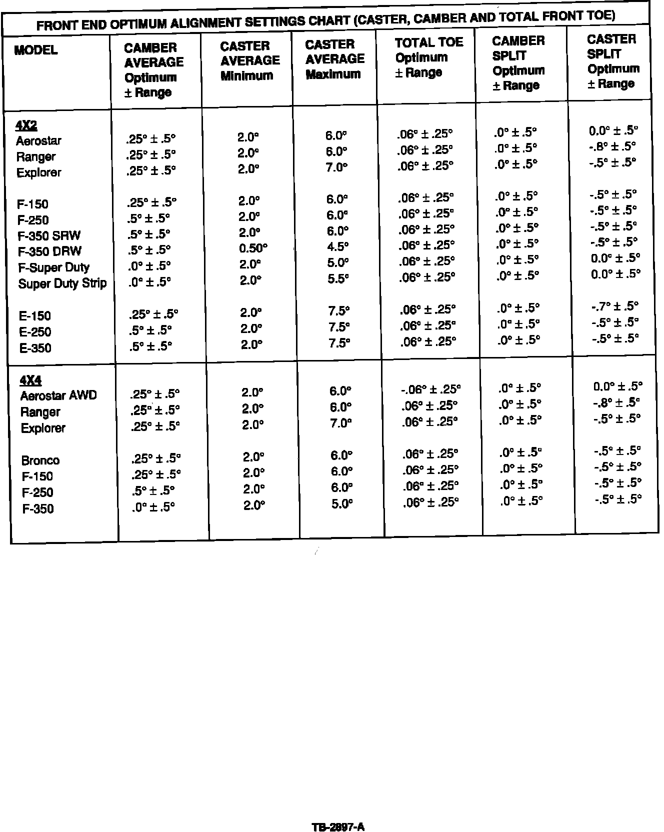 The Front End Alignment Settings Chart, Figure 1, provides optimum alignment settings and recommended allowable ranges for light truck alignments. The ranges given in this chart are only recommended guidelines within which most customers would not indicate concern with vehicle alignment.