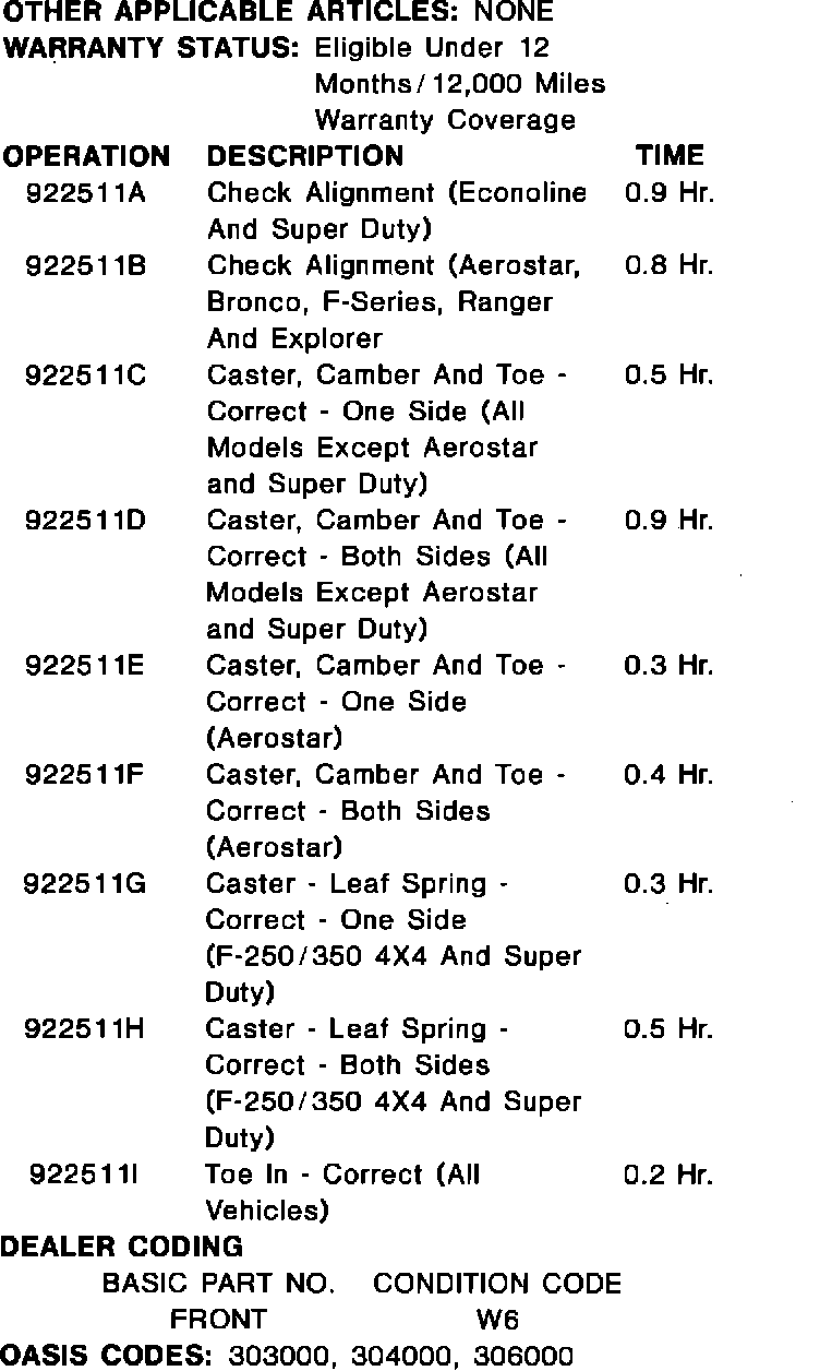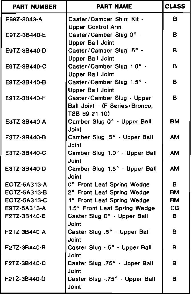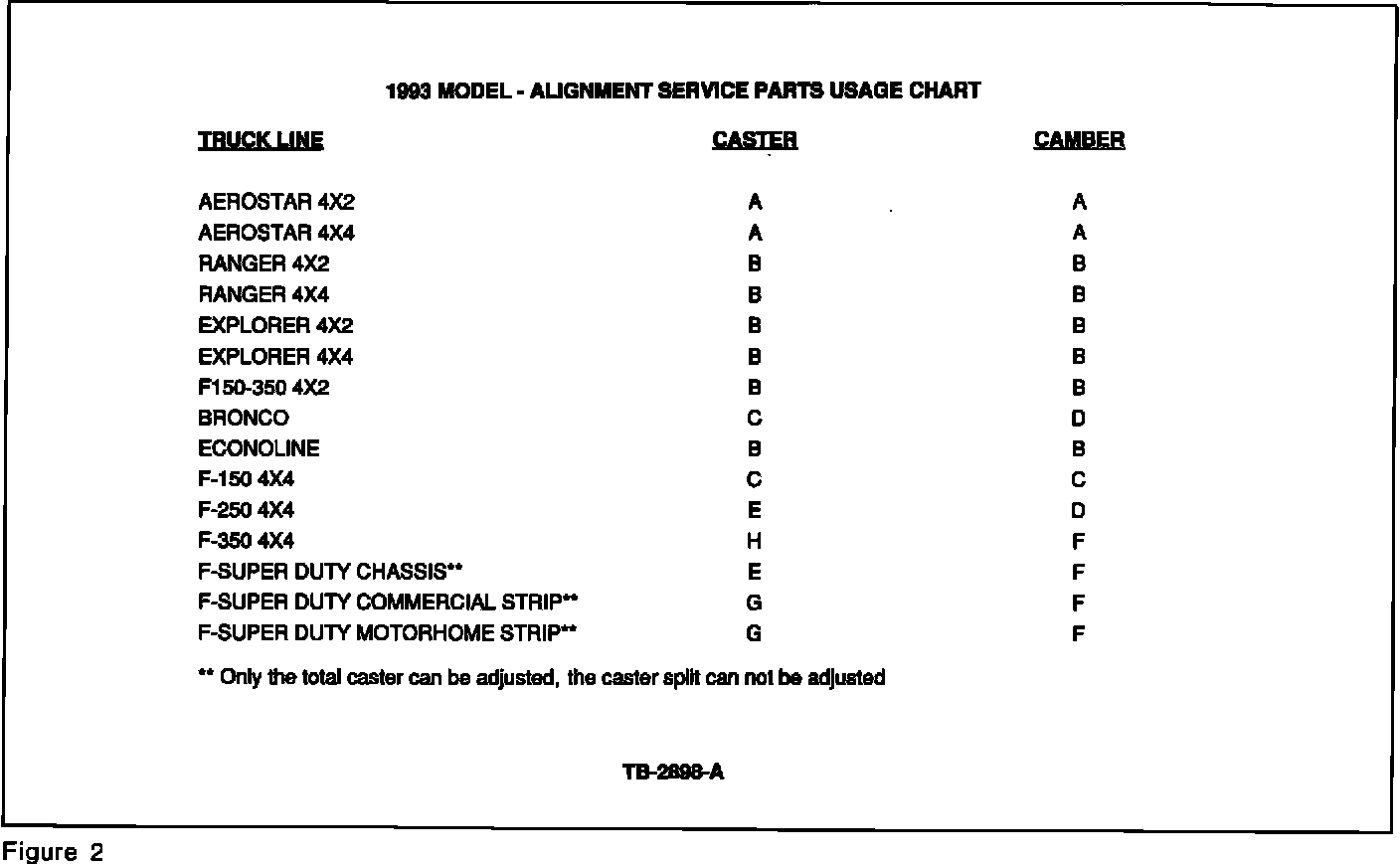 If Light Truck Service Manual Diagnostics indicate the need for a front alignment adjustment, use the optimum alignment settings and caster/camber adjustment parts list, Figure 2. Refer to the appropriate 1993 Light Truck Service Manual for service details.