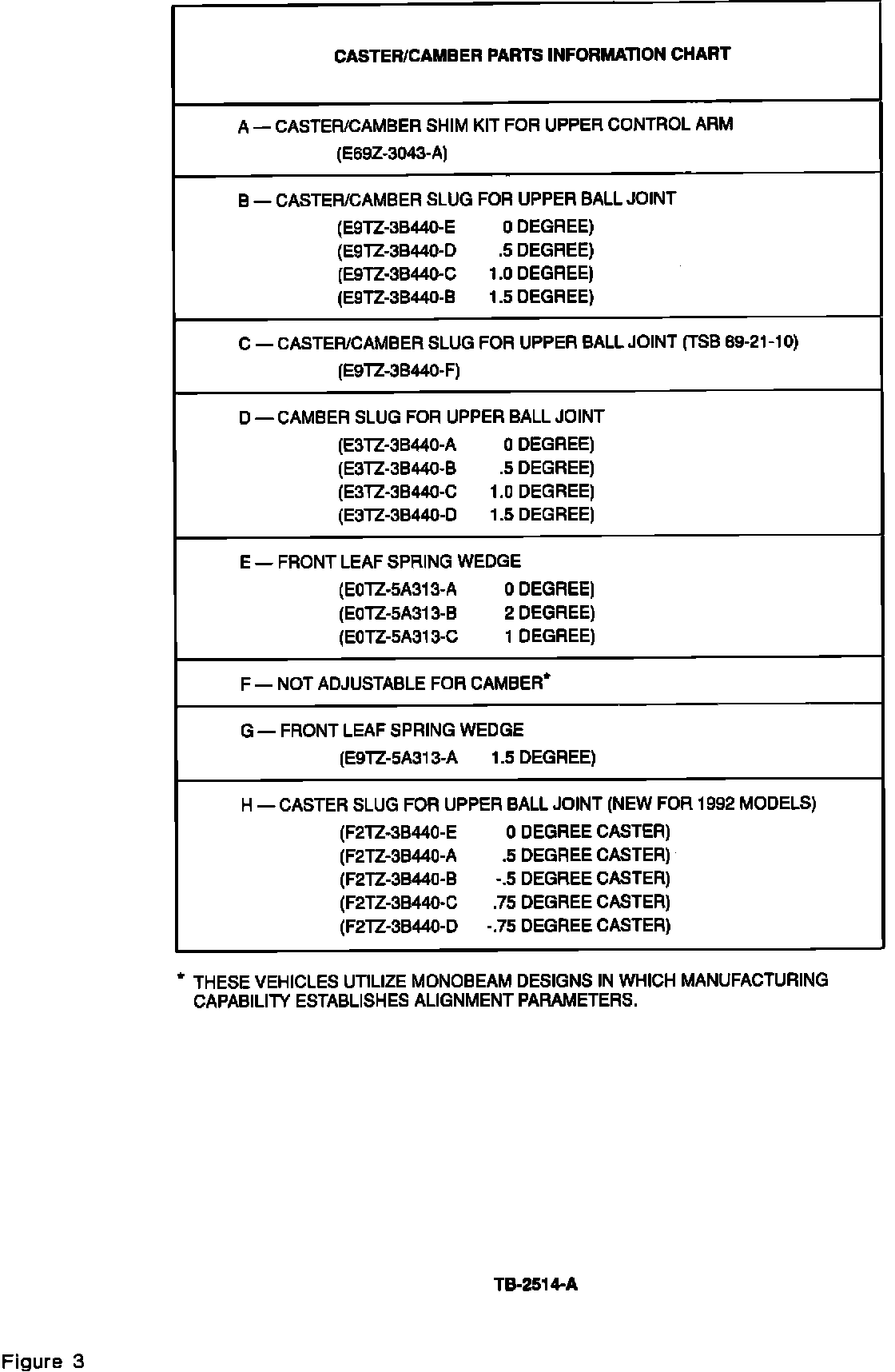 The 1993 Model - Alignment Service Parts Usage Chart, Figure 2, provides correct parts usage for each type of vehicle. Select the appropriate parts group from this chart and use the Caster/Camber Parts Information Chart, Figure 3, to order the parts required.