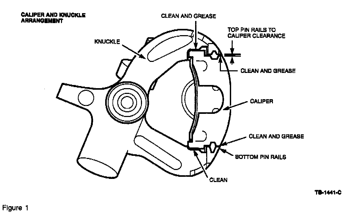 ^ Lubricate and corrosion protect by applying a light coat of Silicone Brake Caliper Grease and Dielectric Compound (D7AZ-19A331-A), or equivalent meeting Ford specification ESE-M1C171-A, to the inner knuckle top and bottom pad groove and caliper rails (Figure 1)