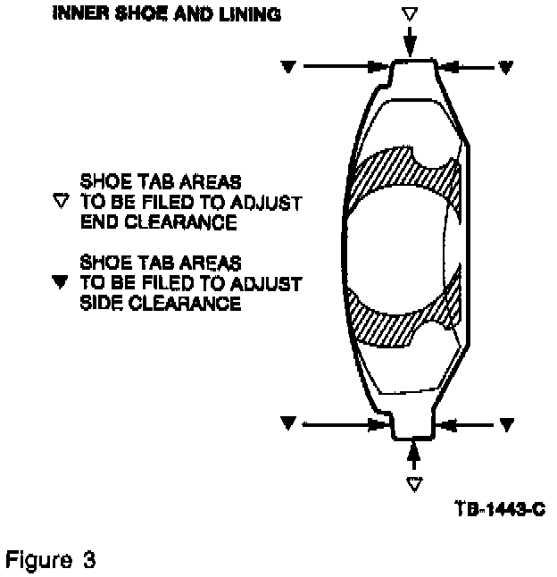 g. If the pad clearances are within specification, go to Step 1h. If the pad clearances are not to the required dimensions, file the steel backing plate. File material at ends of shoes, removing equal amounts from both sides or ends (Figure 3).