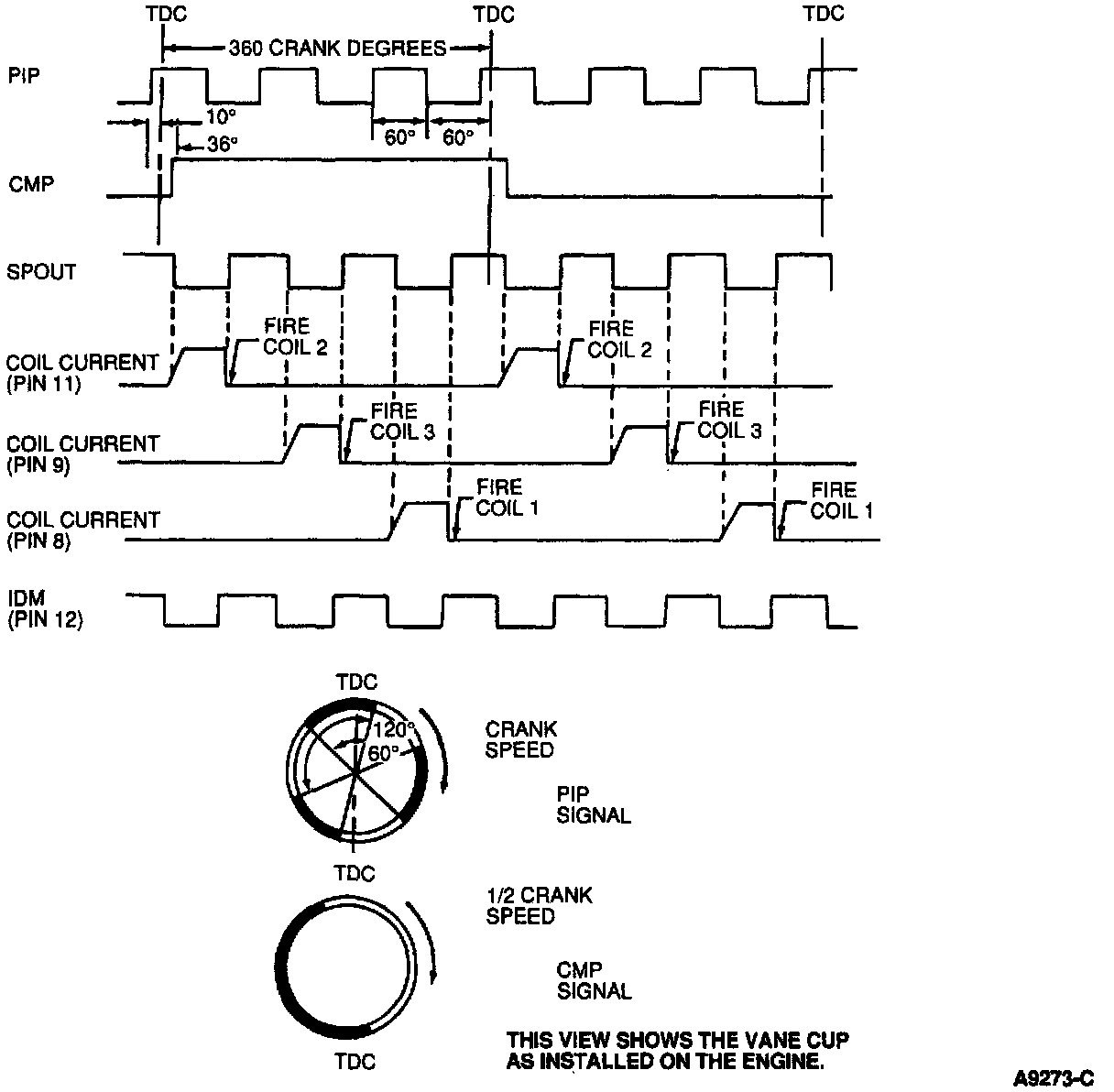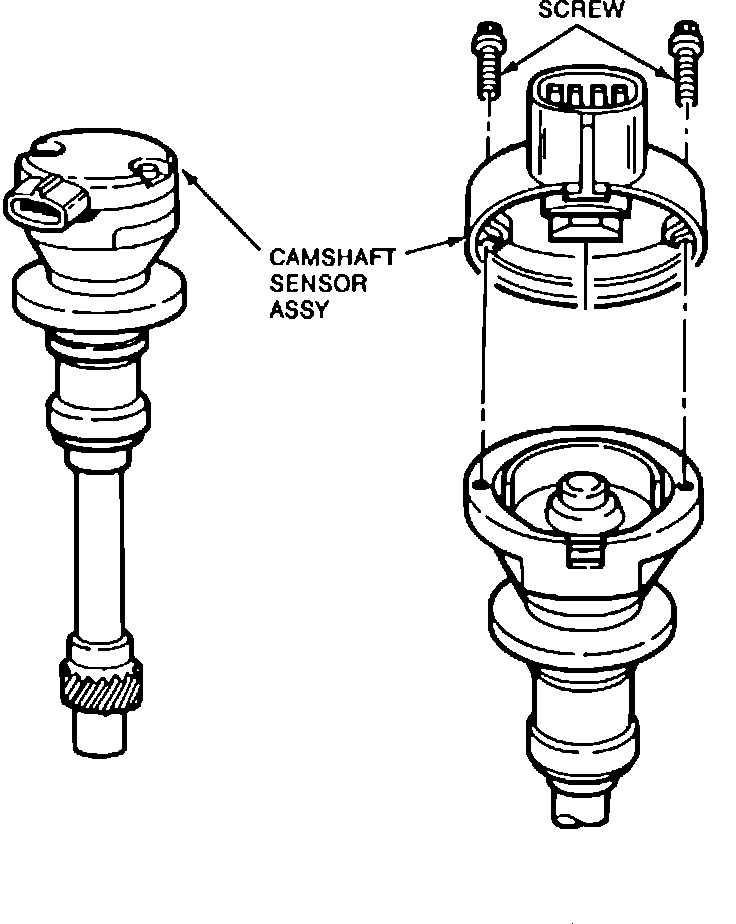 The camshaft drives a single vane hall effect switch, As the vane passes through the hall effect switch it creates a square wave signal which alternates between battery voltage and 0.0 volts.