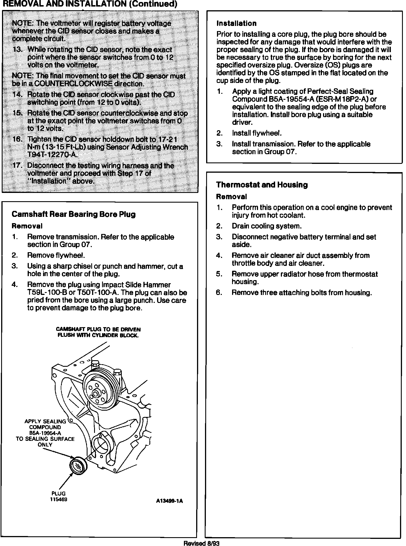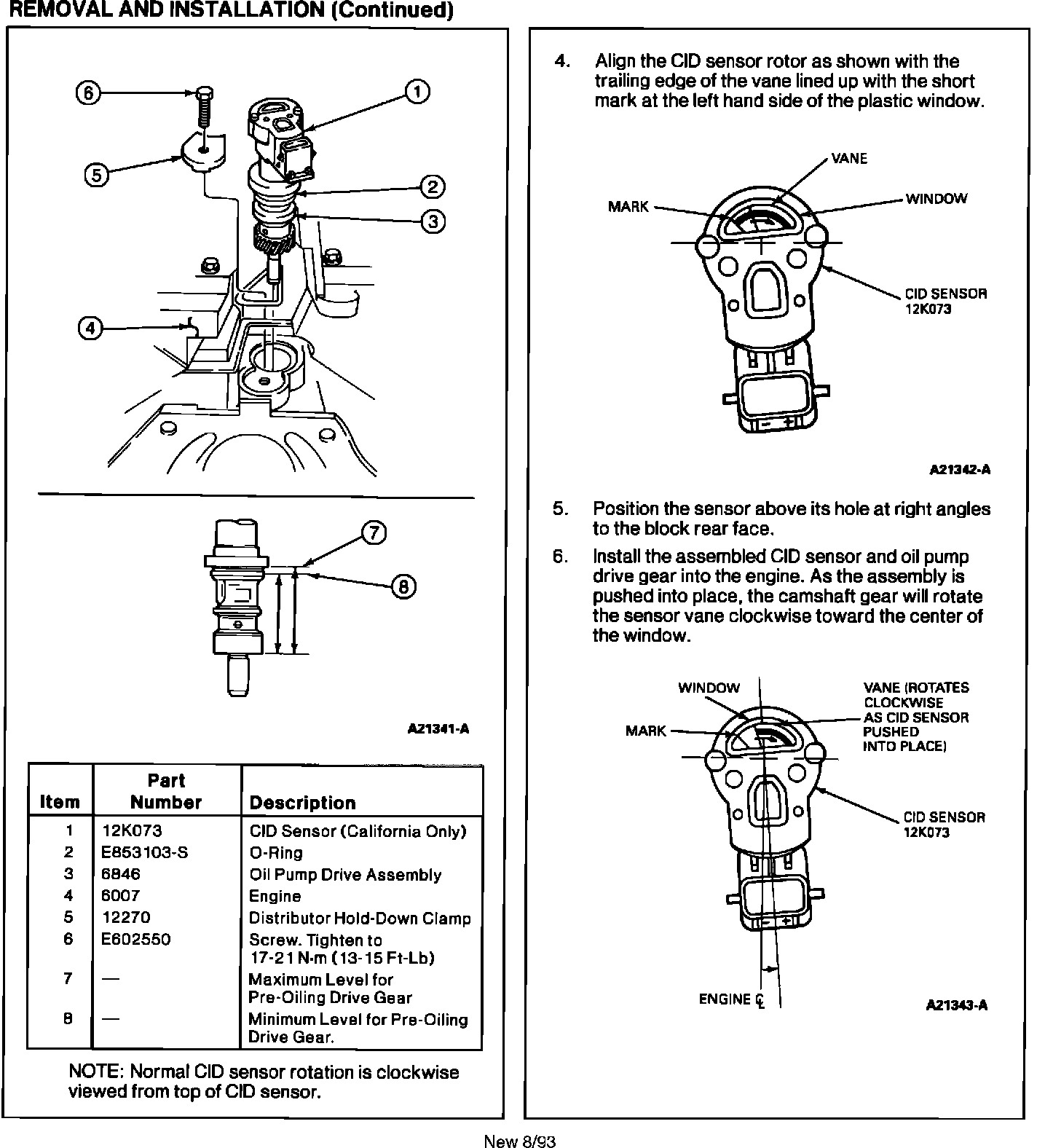 Camshaft removal and installation procedures require revision to accommodate the presence of the CID Sensor, and provide alignment procedures for the sensor. Also, Camshaft installation procedures, applicable to Ranger/Explorer, California only, must be added. Pages 03-01D-21 and 03-01D-22 of the 1993 Aerostar/Ranger/Explorer Service Manual (Powertrain/Drivetrain) are affected; Pages 03-01D-22A through 03-01D-22C are new.