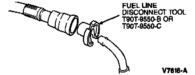 1. To disengage the tube from the fitting, snap the Fuel Line Disconnect Tool T90T-9550-B 5/16 inch (Gray) and T90T-9550-C 3/8 inch (Blue) or equivalent with either tab on the fuel line-to be disconnected.