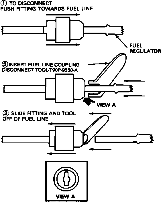 c. To disengage the fitting from the fuel pressure regulator, push the fitting toward the fuel pressure regulator, insert the fingers on Fuel Line Coupling Tool T9OP-955-A into the slots in the coupling.