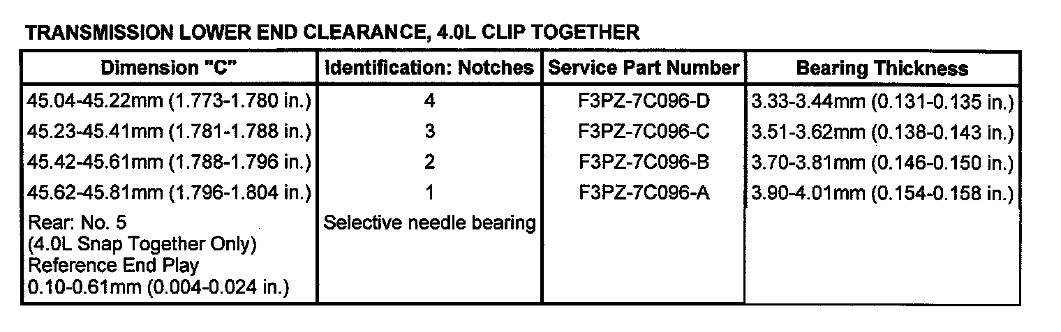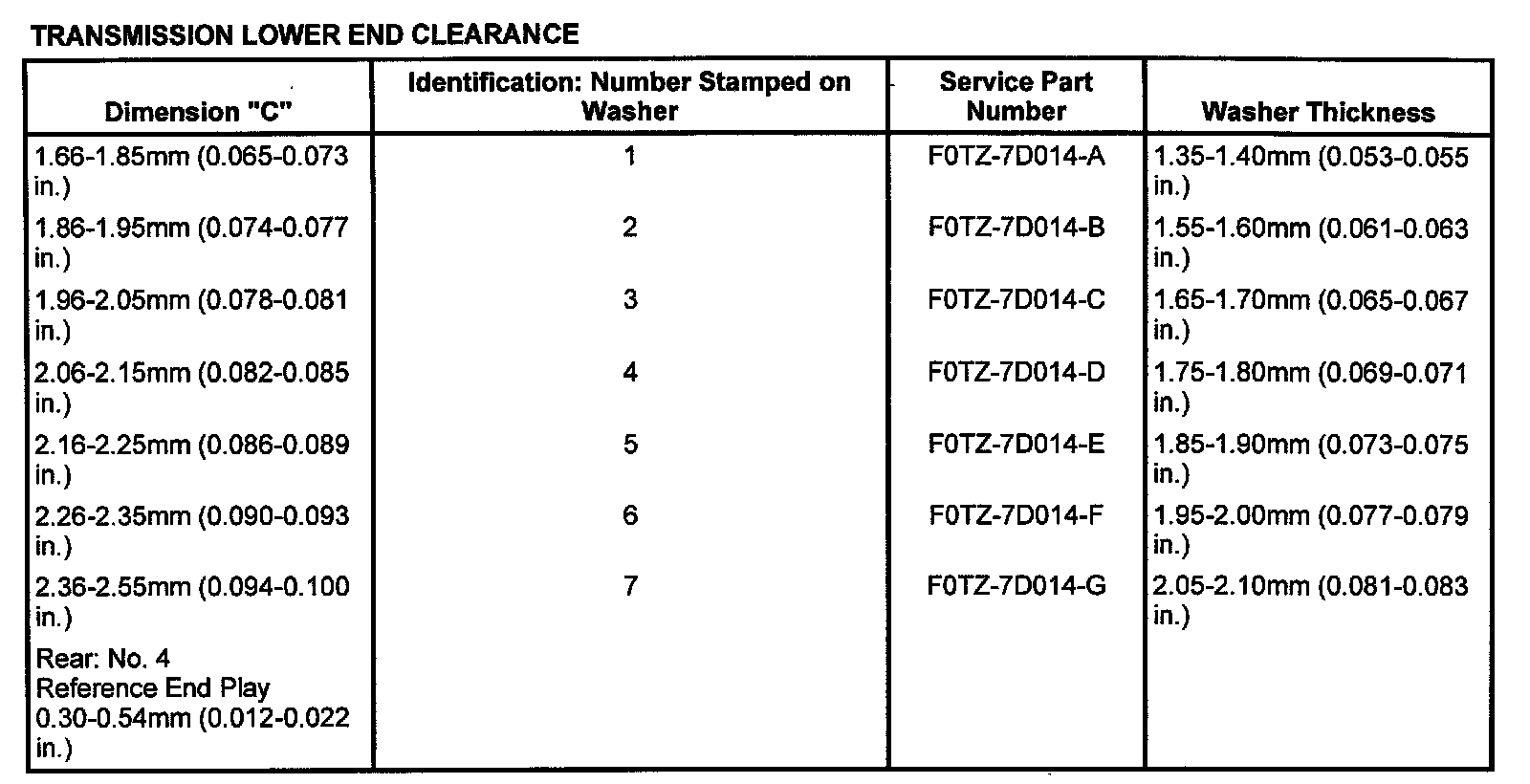 6. See chart for proper thrust washer selection with Dimension "C" from above step.
