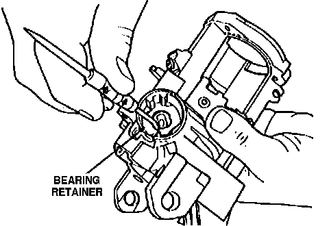 The following procedure applies to vehicles where the ignition lock is inoperative or lock cylinder cannot be rotated due to broken or missing ignition key and the key number is unknown, or the lock cylinder cap is damaged and/or broken so that lock cylinder cannot be rotated.Fig. 5 Removing Ignition Lock Bearing Retainer: