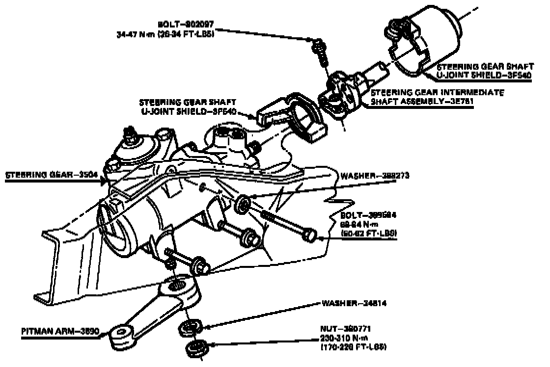 4. Slide the steering gear input shaft into the flex coupling and into place on the frame side rail. install the attaching bolts and lighten to 68-84 N.m (50 - 62 ft. lbs.). Tighten the flex coupling bolt to 34 - 47 N.m (26 - 34 ft. lbs.).