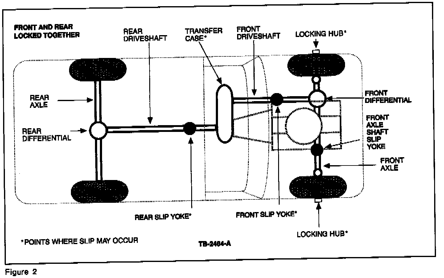 ^ If the system slips under load, find what has broken or is slipping. To locate where slip is taking place, put marks at various possible slip points (Figure 1). Test drive the vehicle, then check to see if marks at different points are still in the same relationship to each other. This will help you determine where the slippage is taking place or where to look for broken parts, if any.