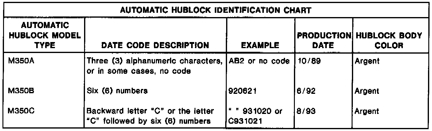 A stamped code found on the rear of the automatic hublock flange face can be used to identify the automatic hublock type, in addition to the model year summary described above. Examples of the three (3) different codes which correlate to the automatic hublock model type are outlined in the chart:
