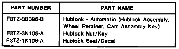IF AN M350A OR M350B HUBLOCK REQUIRES SERVICING, ALL THE HUBLOCK COMPONENTS MUST BE REMOVED AND REPLACED WITH SERVICE KIT F3TZ-3B396-B, WHICH ESSENTIALLY IS THE SERVICE KIT FOR THE M350C AUTOMATIC HUBLOCK. THE CAM ASSEMBLY OF THE M350A OR M35OB SHOULD NOT BE USED WITH AN M350C AUTOMATIC HUBLOCK BODY NOR SHOULD AN M350A OR M350B AUTOMATIC HUBLOCK BODY BE USED WITH AN M350C CAM ASSEMBLY.