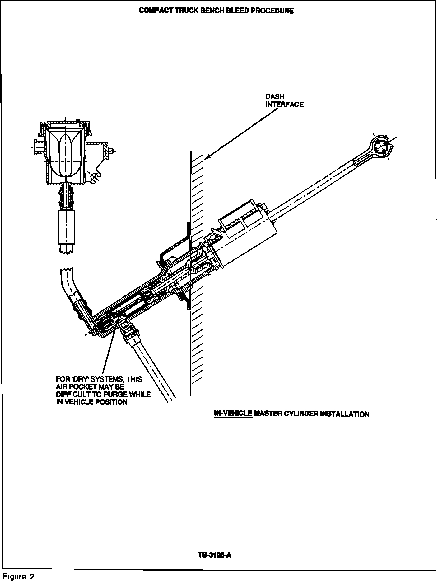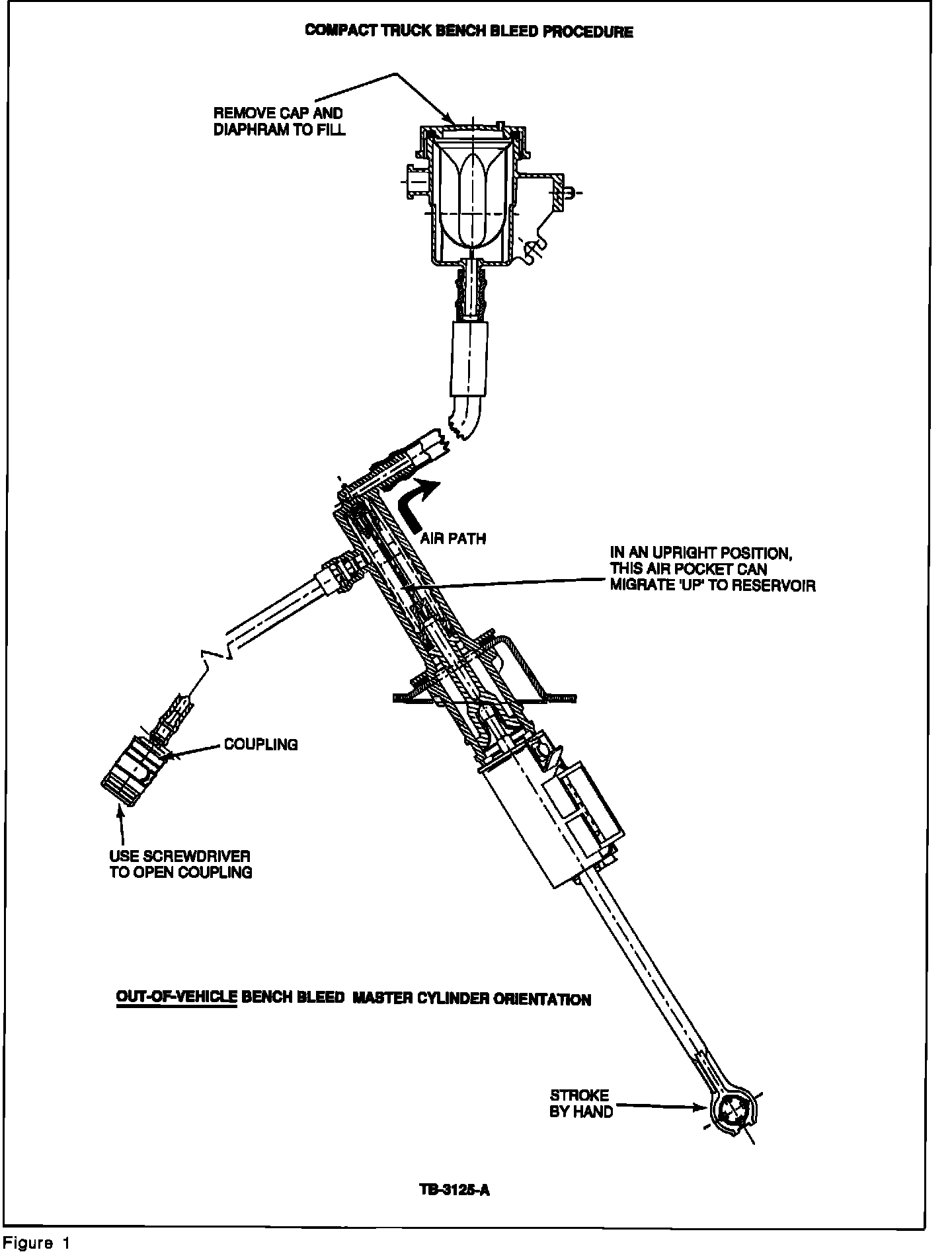 The compact vehicles are more difficult to bleed because the downward angle of the master cylinder makes it difficult for air to escape up into the reservoir. Therefore, if the master cylinder is removed from the vehicle and bled while held in a vertical orientation (a bench bleed) air can escape much more efficiently. Refer to Figure 1.