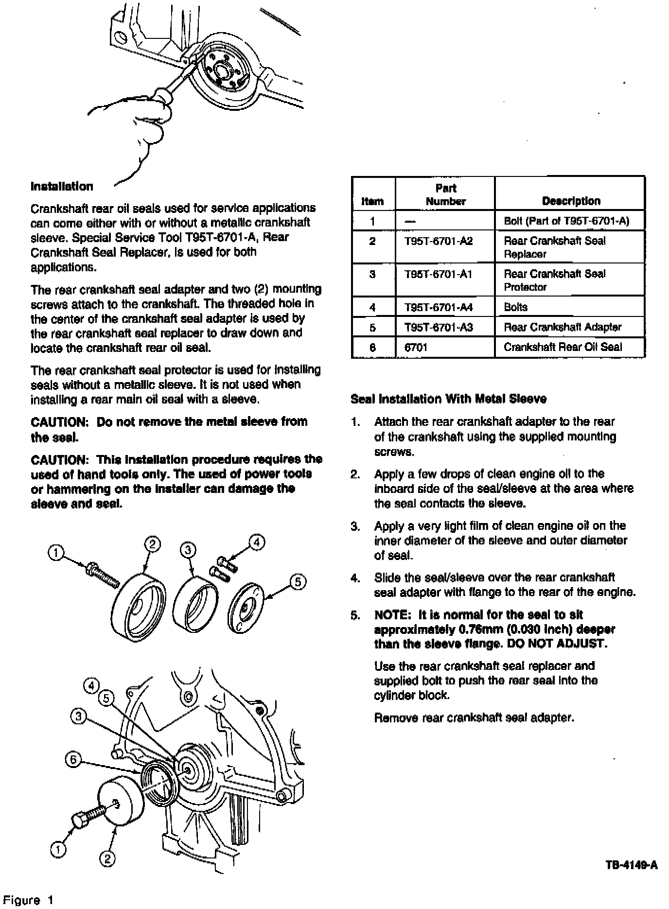 If an oil leak is detected, refer to TSB 94-12-13 for proper diagnosis of the oil leak. If, after diagnosis, it is determined that a new rear main seal needs to be installed, use the procedure found in TSB 94-12-13. Be sure to use the new Rear Oil Seal Replacer Tool (T95T-6701-A) when installing a new rear main seal. Refer to Figure 1 for more details.