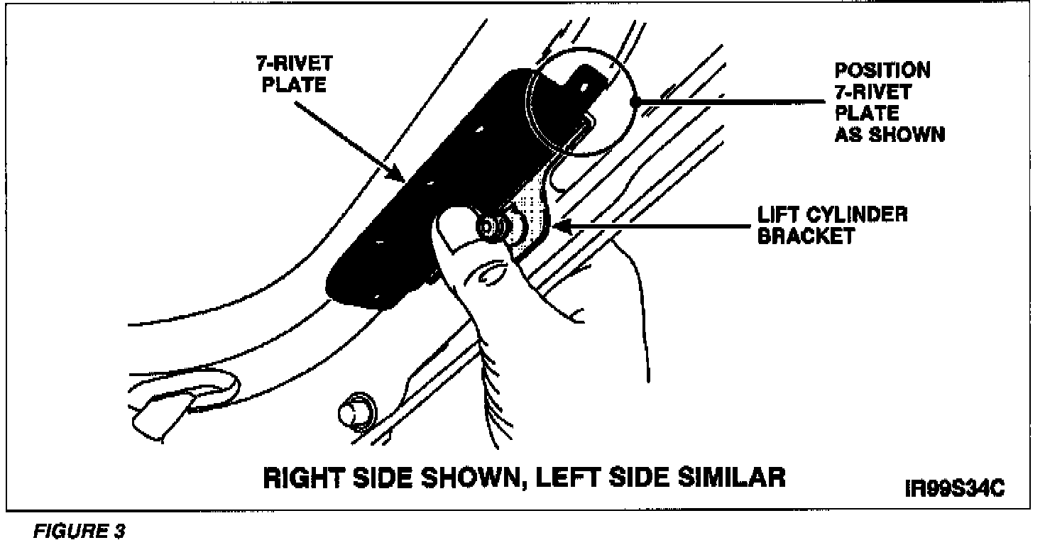 5. Position the 7-rivet plate over the lift cylinder bracket in the location shown in Figure 3.