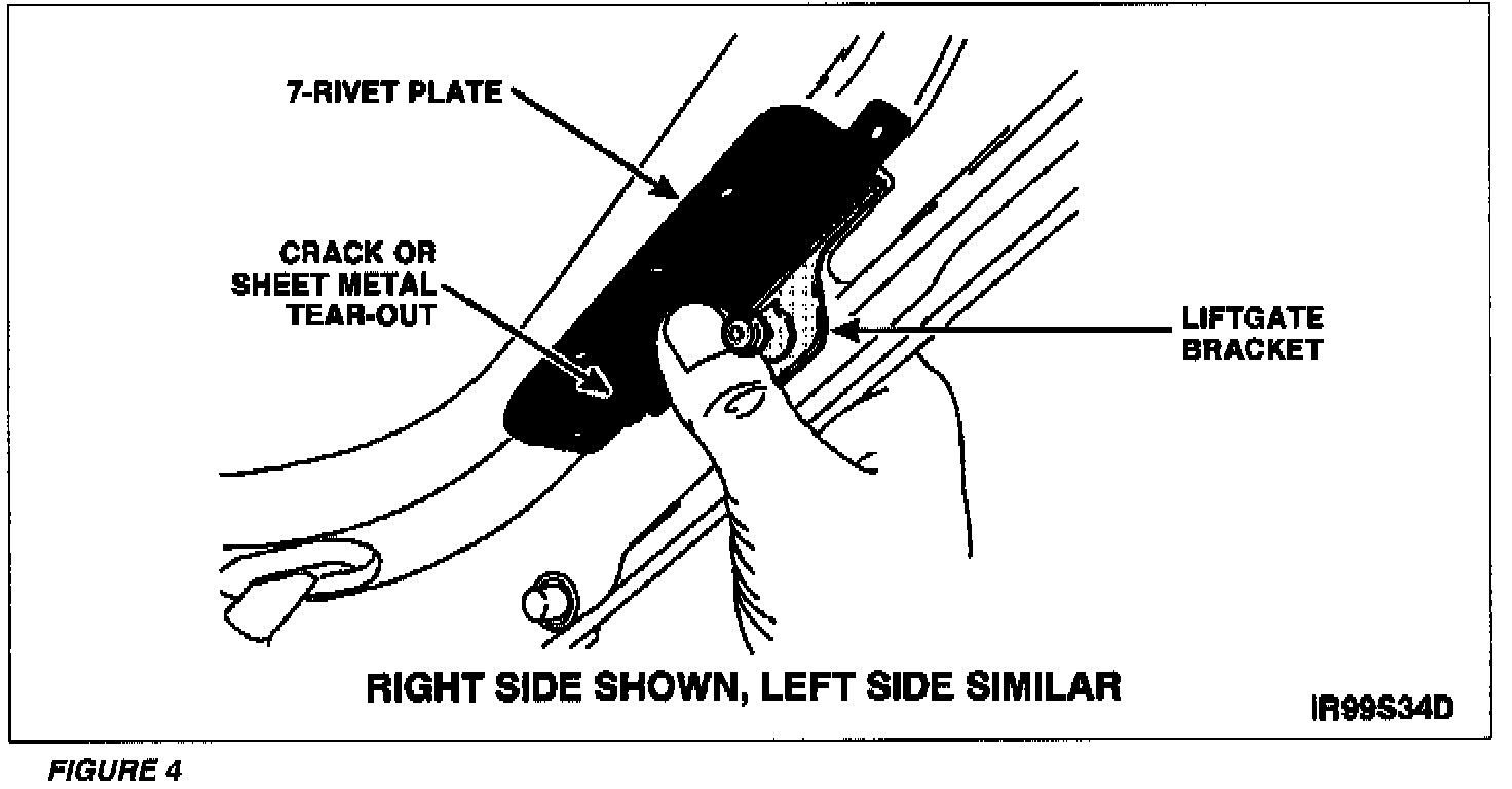 If the sheet metal crack or tear-out goes beyond the 7-rivet plate, the liftgate must be replaced.