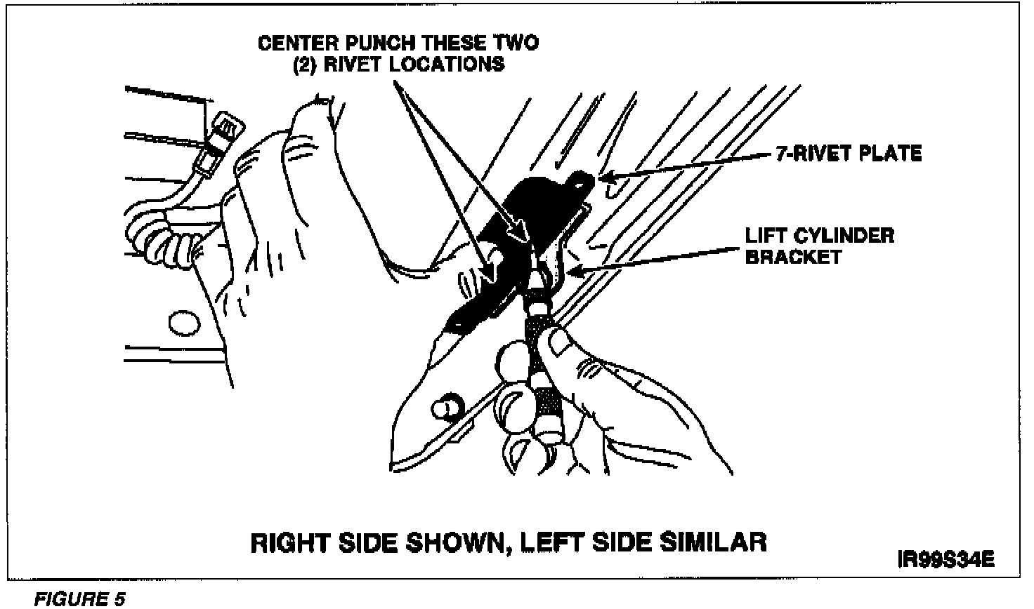 6. With the 7-rivet plate correctly positioned over the lift cylinder bracket, center punch the two (2) rivet hole locations shown in Figure 5. This step marks the lift cylinder bracket rivet locations.