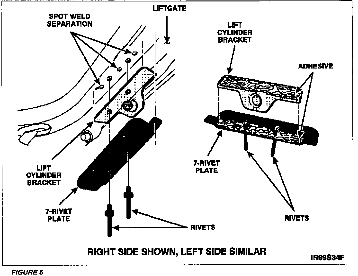 19. Install the lift cylinder bracket, 7-rivet plate and the rivets as an assembly onto the liftgate. Proceed to Step 21.