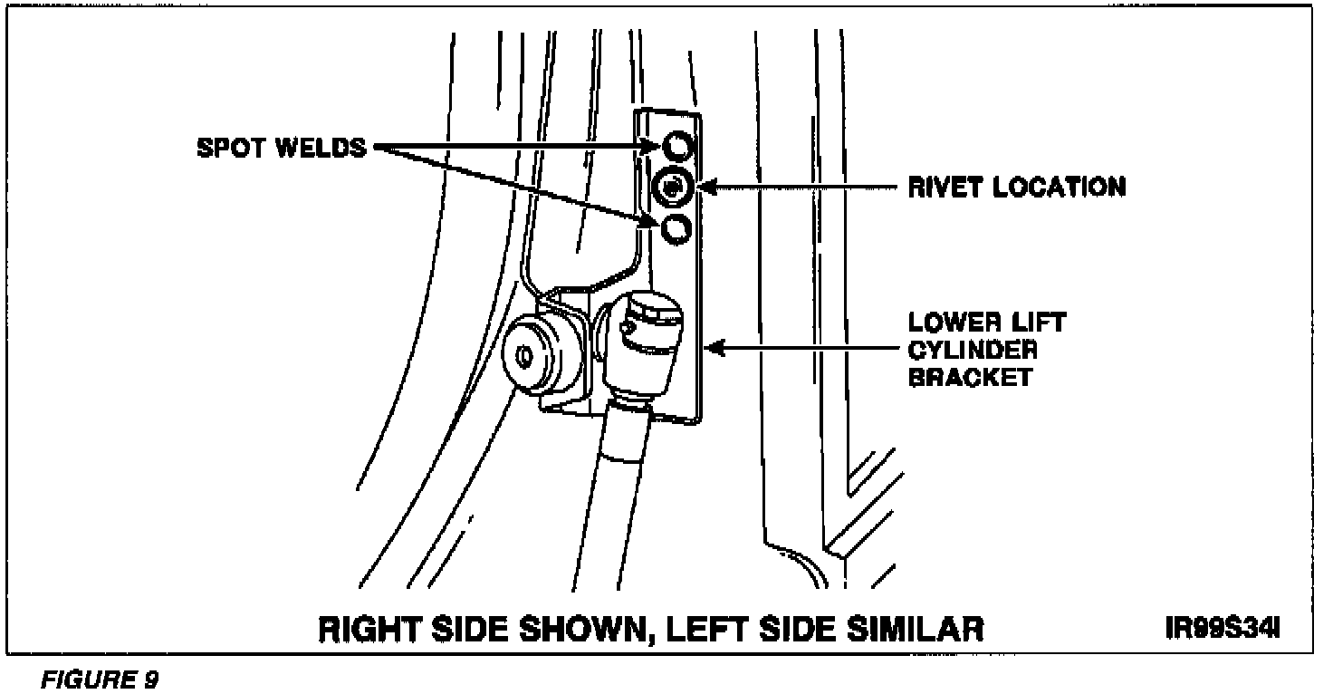 25. Center punch the center point between the two upper spot welds on the lower lift cylinder bracket. See Figure 9. This point should be approximately 20 mm (3/4 inch) from the top of the bracket and centered horizontally.