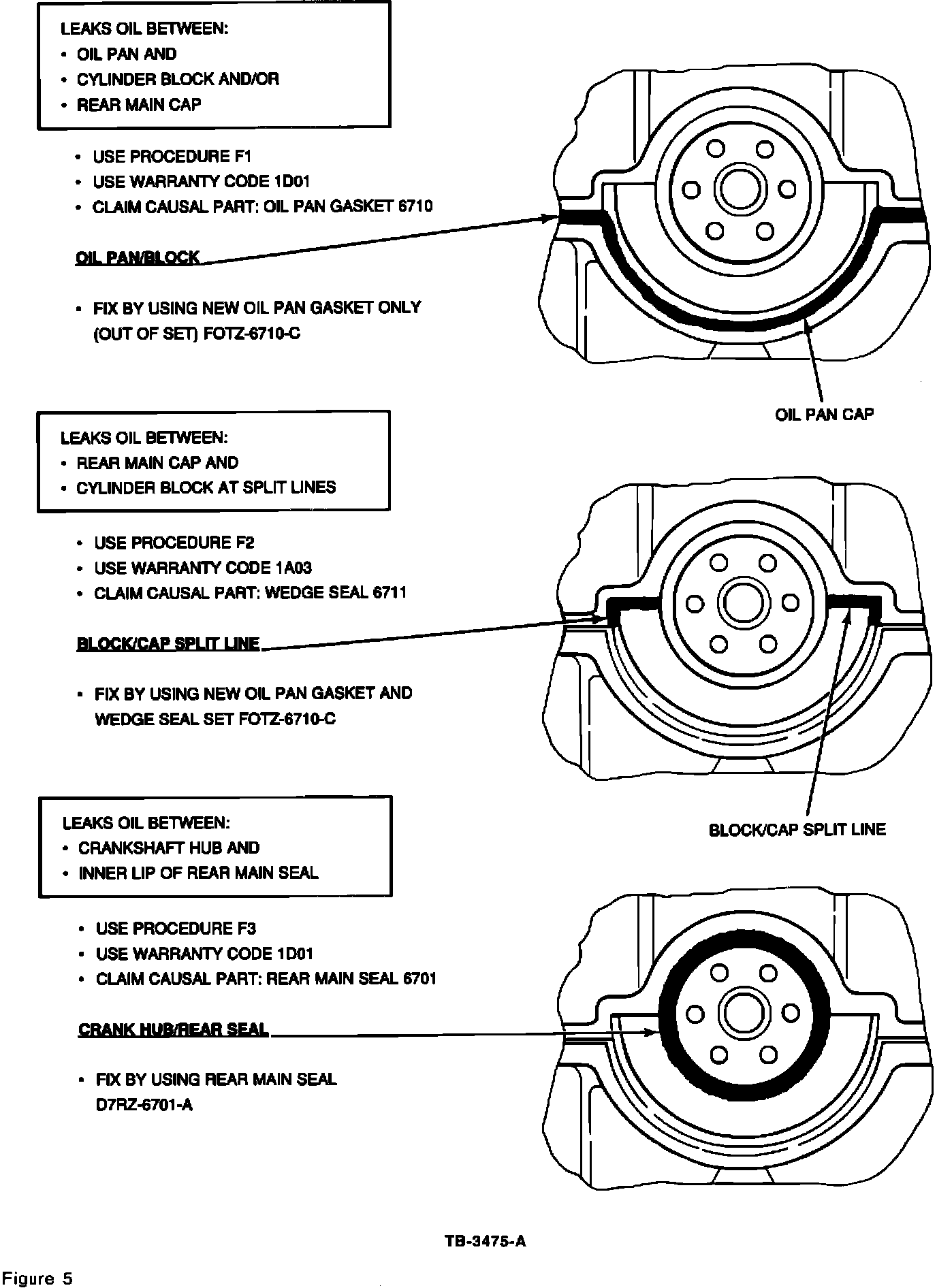 ^ If bubbles are detected only at the oil pan gasket, between the oil pan and the cylinder block, or between the oil pan and the rear main cap, only the oil pan gasket needs replacing. Note Procedure A, Figure 2, Step A3/F1, and pictorial, Figure 5. Proceed to SERVICE PROCEDURE - REPAIR REAR END OIL LEAK, Procedure A1.