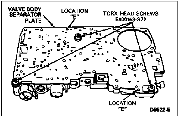 3. Install the separator plate using two tapered punches at locations "E" to align gasket and separator plate-to-valve body. Install three Torx head screws to retain separator plate and gasket to valve body. Tighten screw to 6-8 Nm (53-71 lb-in).