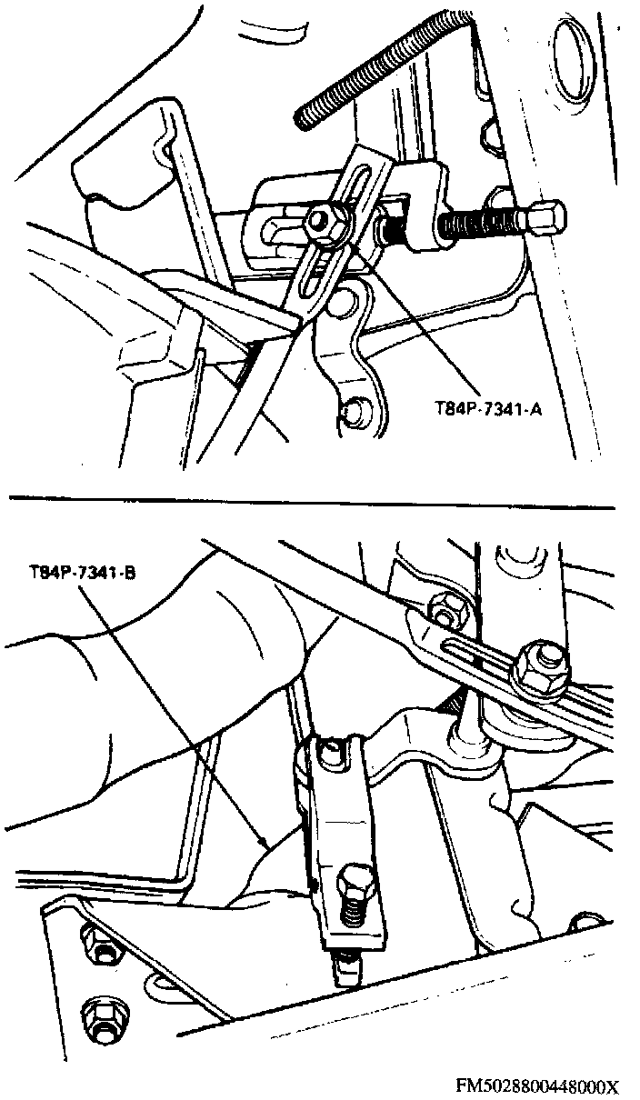 1. Disconnect linkage from grommet, then position shift linkage grommet remover T84P-7341-A or equivalent, and rotate screw in tool until grommet is forced out of lever.