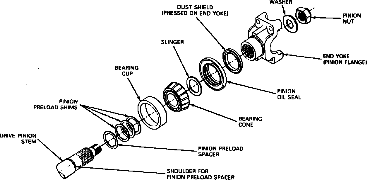19. Remove drive pinion by tapping on drive pinion shaft using a rawhide or plastic hammer. Catch pinion to prevent damage to pinion teeth. Gear teeth may have sharp edges, use care when handling gear to prevent personal injury. On spline end of pinion there are bearing preload shims. Collect shims and keep together for reassembly. Model 70 axles may also use a pinion preload spacer with preload shims, preload spacer must be assembled in sequence shown in Fig. 6, or unit failure may occur.