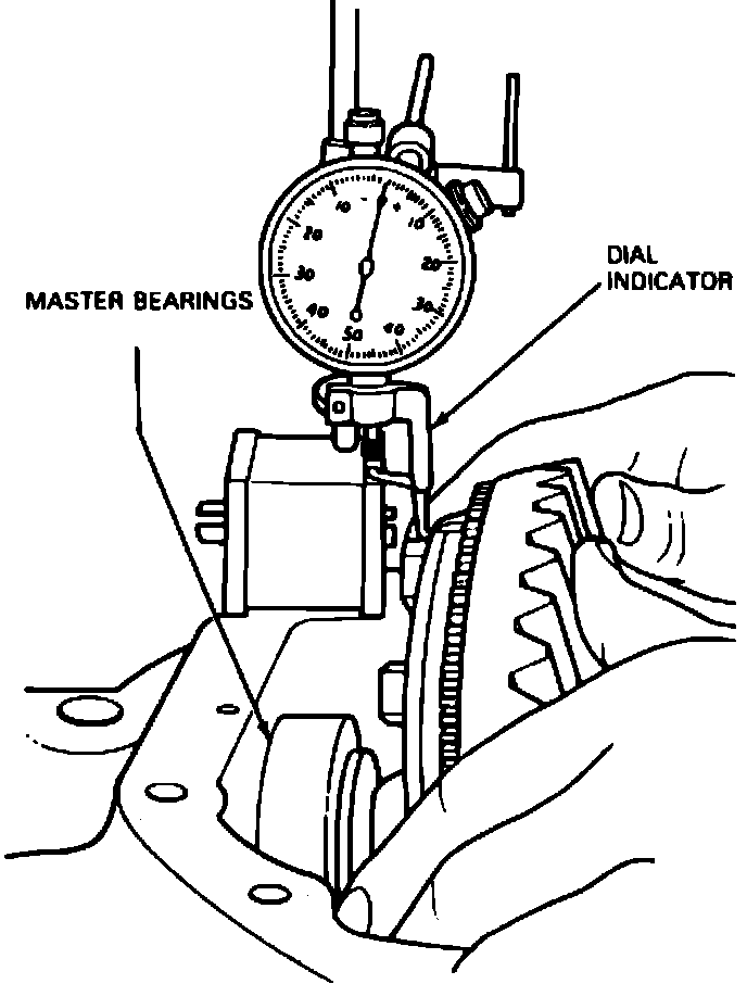 9. Place differential case into carrier (without pinion). Differential case should move freely in carrier assembly. Position a suitable dial indicator against differential case flanges. Locate tip of indicator on flat surface of one ring gear bolt, Fig. 7. Force differential case toward dial indicator as far as possible and zero dial indicator with force still applied. Dial indicator should have a minimum of .200 inch. Force differential case away from dial indicator as far as it will go. Repeat this procedure until same reading is obtained. Record dial indicator reading as measurement ``A'' on a worksheet for calculating ring gear backlash and differential bearing preload shims. This reading indicates amount of shims needed behind differential side bearings to take up total clearance between differential bearing cup and carrier. This reading will be used during ``Pinion & Ring Gear Backlash.''