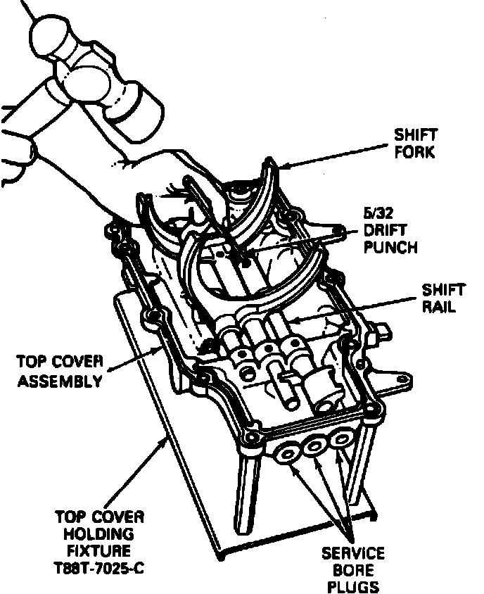 9. Position 1st/2nd shift rail into top cover through service bore. If necessary, insert a 5/16 inch drift punch through spring pin bore and gently rock shift rail from side to side while maintaining forward pressure.
