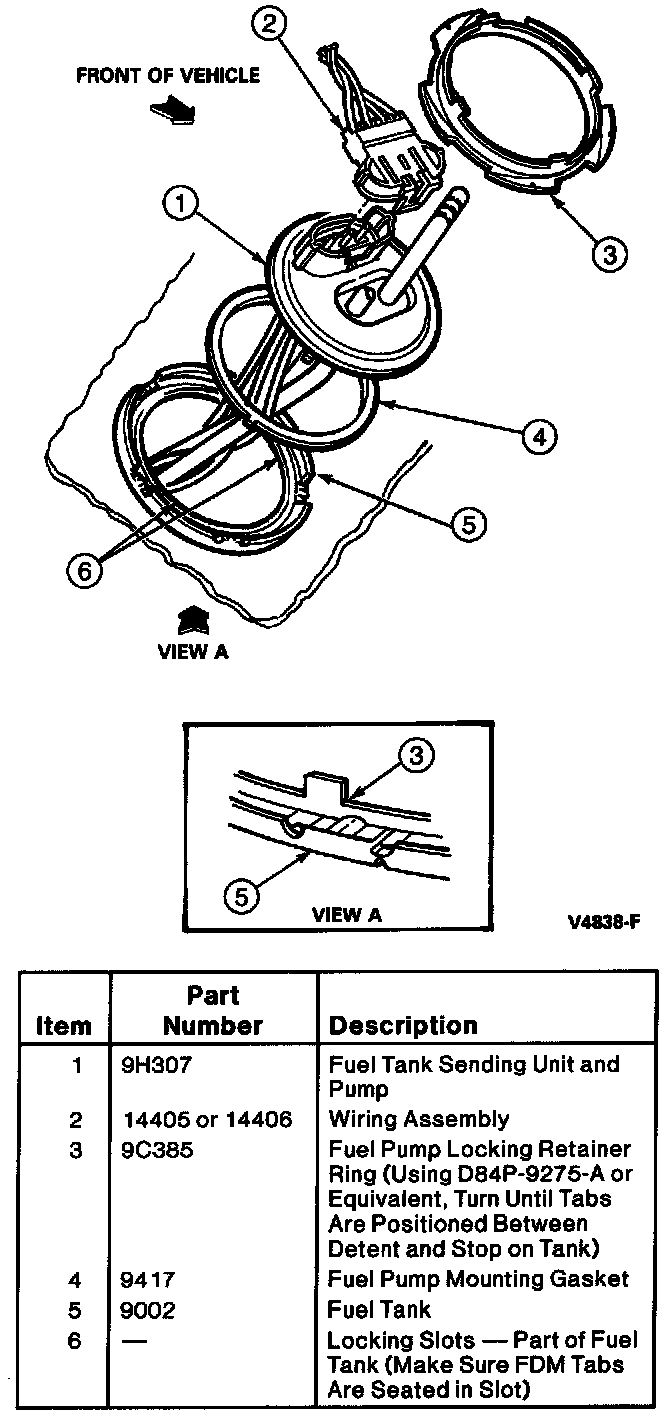 3. Install fuel pump and sender assembly carefully to ensure that the filter is not damaged. Be sure that the locating keys are in keyways and the seal ring remains in place.