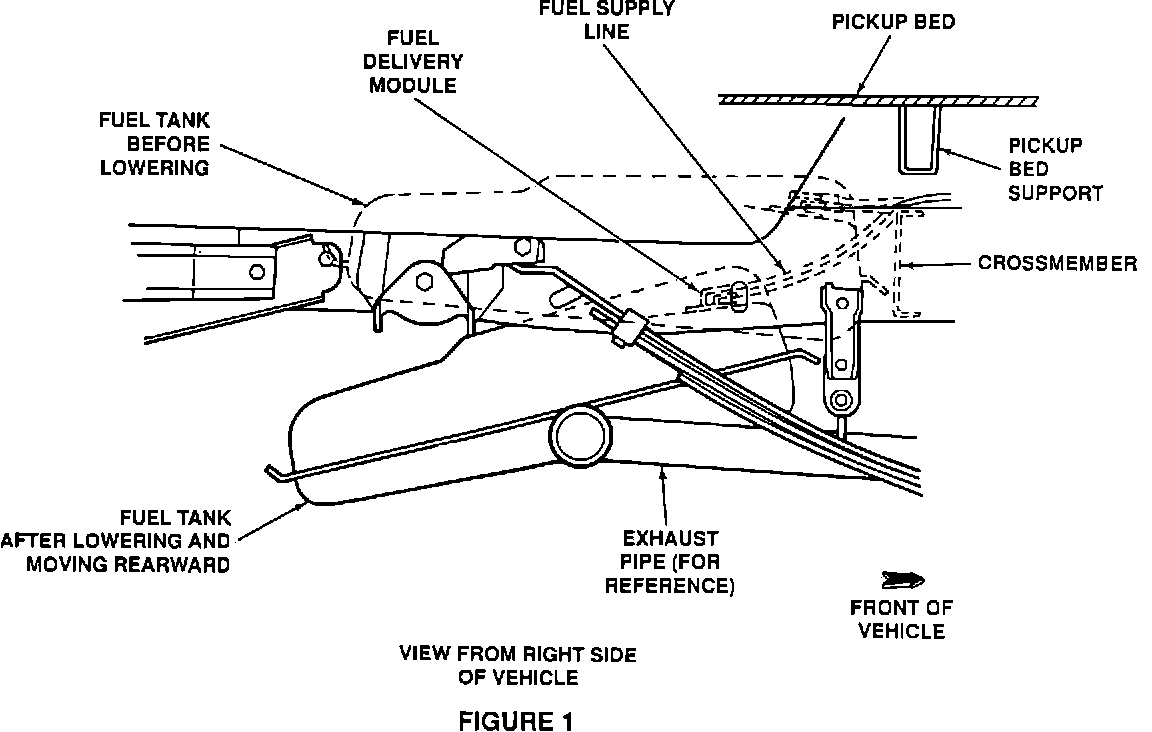 6. SUPPORT THE TANK AND REMOVE THE BOLTS ATTACHING THE TANK SUPPORTS TO THE FRAME. SLOWLY BEGIN TO LOWER THE TANK WHILE KEEPING THE FRONT OF THE TANK UP AS THE TANK IS LOWERED FROM THE REAR FIRST. SEE FIGURE # 1. MOVE THE TANK A FEW INCHES REARWARD AS THE TANK IS BEING LOWERED - BE SURE THAT THE FUEL LINES AT THE FRONT OF THE TANK ARE MOVING FREELY AND NOT BINDING ON THE CROSSMEMBER. DO NOT LOWER THE TANK MORE THAN 4-5 INCHES. THIS WILL PROVIDE ACCESS TO THE FUEL DELIVERY MODULE AT THE FRONT OF THE TANK. SEE FIGURE # 2. IF THE TANK IS LOWERED MORE THAN 4-5 INCHES, OR IF THE TANK IS LOWERED STRAIGHT DOWN WITHOUT ALSO MOVING IT A FEW INCHES REARWARD, THE FUEL DELIVERY MODULE PORTS COULD BE BENT.