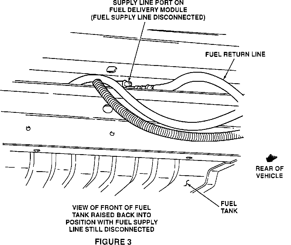8. WITH THE FUEL SUPPLY LINE STILL DISCONNECTED, CAREFULLY MOVE THE FUEL TANK BACK INTO POSITION BY LIFTING THE FRONT OF THE TANK FIRST. BE CAREFUL NOT TO KINK THE FUEL LINES AT THE FRONT OF THE TANK. SEE FIGURE # 3. POSITION FUEL TANK SUPPORTS AND INSTALL ATTACHING BOLTS AND NUTS. TIGHTEN TO 37-50 N-m (27-37 FT.LB.). FOR ADDITIONAL INFORMATION, SEE TSB 91-23-10.
