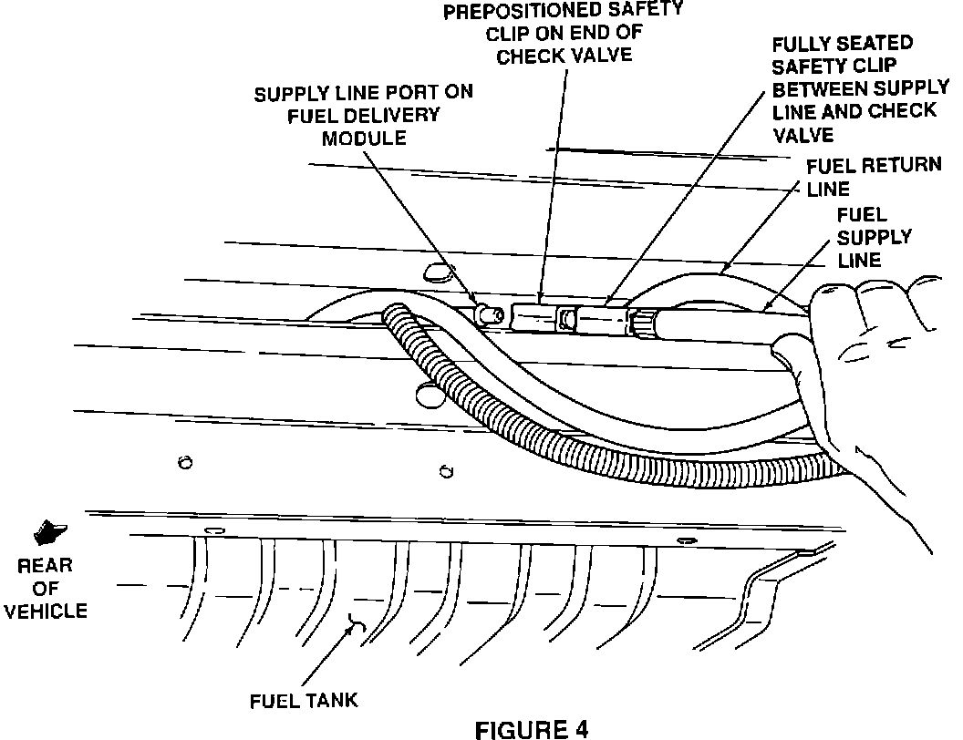 8. When reinstalling fuel lines after installation of the check valve connector from the kit, be sure that BOTH safety clips are properly reinstalled (one clip between check valve connector and the fuel delivery module; second clip between the fuel supply line and the check valve connector).