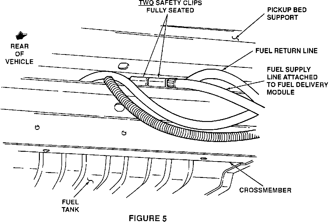 12. CONNECT THE FUEL SUPPLY LINE AND CHECK VALVE CONNECTOR ASSEMBLY (WITH SAFETY CLIP PRE-POSITIONED) TO THE FUEL DELIVERY MODULE BY INSERTING THROUGH THE SPACE BETWEEN THE FRAME CROSSMEMBER AND THE PICKUP BOX BED SUPPORT. SEE FIGURE # 4 AND # 5 BELOW. DO NOT ATTACH UNTIL A SAFETY CLIP IS PRE-POSITIONED ON THE OPEN END OF THE CHECK VALVE CONNECTOR AND THE OTHER SAFETY CLIP IS ATTACHED BETWEEN THE CHECK VALVE AND THE FUEL SUPPLY LINE. (REFERENCE APPENDIX I OF INSTRUCTION SHEET 8117 OR 8118 IN KIT CC OR DD FOR INSTALLATION PROCEDURE). AFTER THE FUEL LINE AND CHECK VALVE CONNECTOR ARE ATTACHED TO THE FUEL DELIVERY MODULE, USE A LARGE FIAT BLADE SCREWDRIVER TO FULLY SEAT THE SAFETY CLIP ONTO THE SUPPLY LINE OF THE FUEL DELIVERY MODULE AND THE CHECK VALVE. MAKE SURE TO POSITION THE SAFETY CLIP SO THE LEGS OF THE CLIP WILL BE HORIZONTAL TO THE GROUND WHEN ATTACHED TO THE FUEL DELIVERY MODULE. BOTH SAFETY CLIPS MUST BE INSTALLED.
