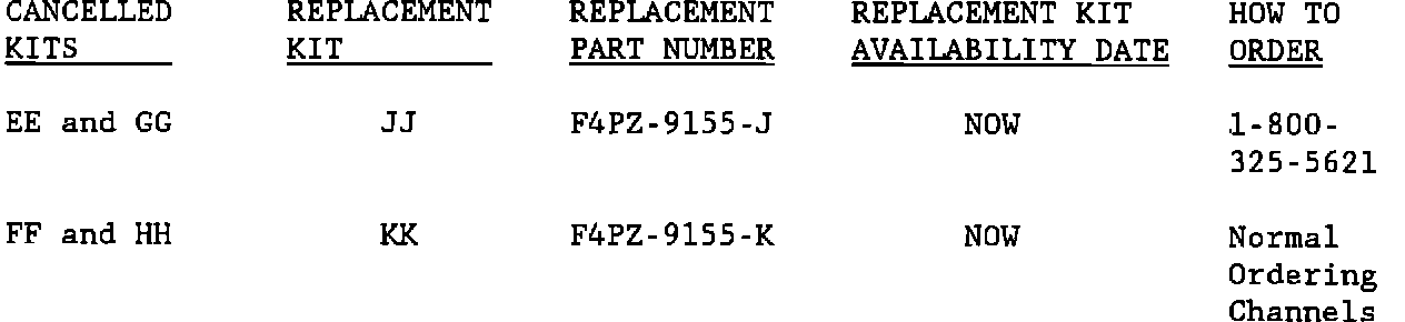EFFECTIVE IMMEDIATELY, KITS EE, FF, GG, AND HH ARE CANCELLED (PART NUMBERS F4PZ-9155-E, -F, -G, AND -H).
