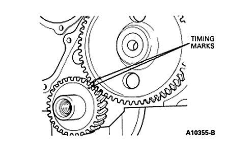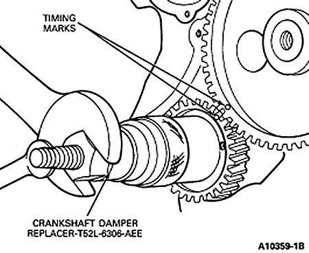 1. Install the key in the crankshaft keyway. Install the crankshaft gear using the Crankshaft Damper Replacer T52L-6306-AEE. Make sure timing marks are aligned properly on the camshaft and crankshaft gears. Install the oil slinger.