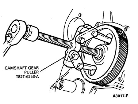 5. Install the Camshaft Gear Puller T82T-6256-A as shown and remove the camshaft gear.