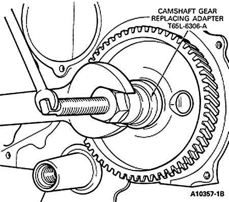 1. Make sure the key spacer and thrust plate are properly installed. Align the gear keyway with the key and install the gear on the camshaft using Camshaft Gear Replacing Adapter T65L-6306-A. Make sure that the timing marks line up on the camshaft and crankshaft gears.