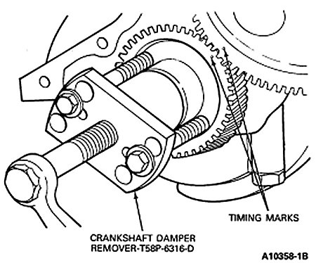 4. Use Crankshaft Damper Remover T58P-6316-D and remove the crankshaft gear. Remove the key from the crankshaft.