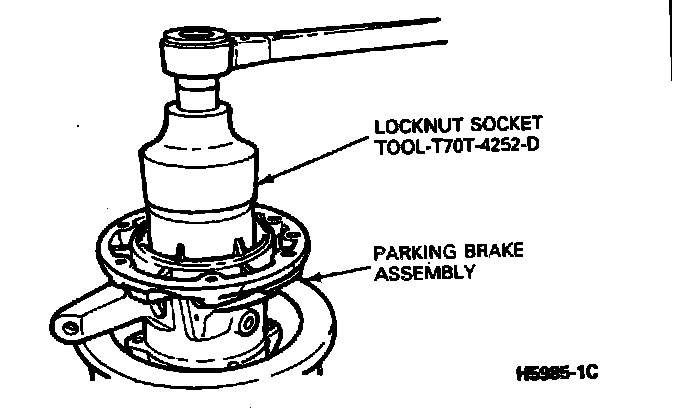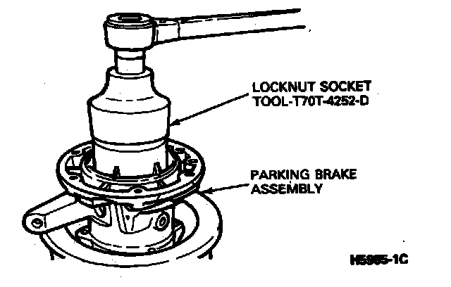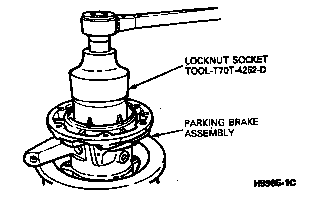 2. Using Tool T7OT-4252-D or equivalent, mount parking brake assembly in vise, using brass jaw protectors to prevent damage. Remove the 65mm hex locknut from the mainshaft.