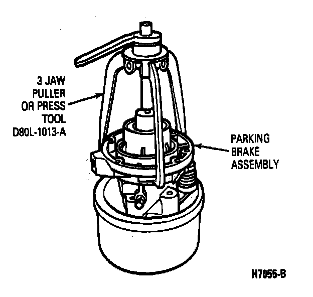3. Using a 3-jaw puller, Tool D8OL-1013-A or a suitable press, remove the mainshaft, brake drum and output flange out of the case assembly.