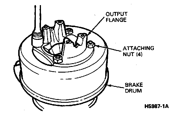 6. Remove the four hex nuts attaching the flange and brake drum to the output shaft. Remove the drum and flange from the output shaft.