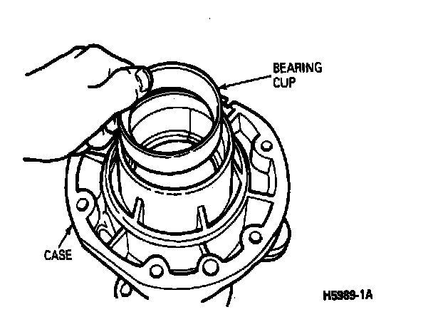 2. Turn the case over and install the outer bearing cup into the case. Press in using Bearing Cup Replacer TB8T-2598-E (or equivalent) until the bearing cup bottoms in the bore.
