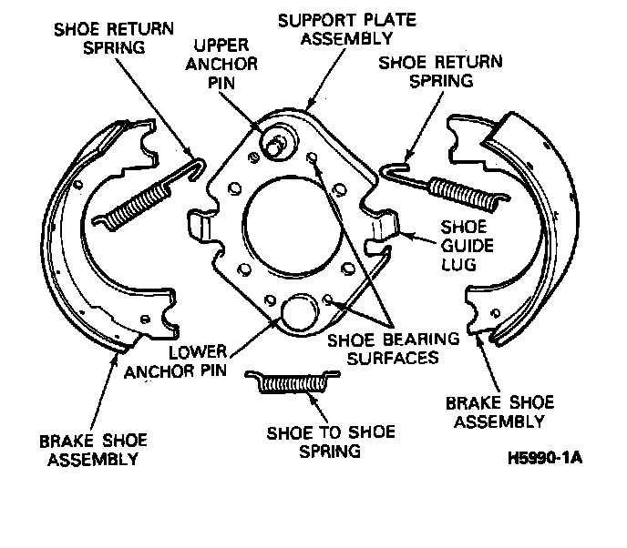 2. Spread the free ends of the brake shoes apart and remove the brake shoes from the lower anchor pin. Remove the shoe-to-shoe spring.