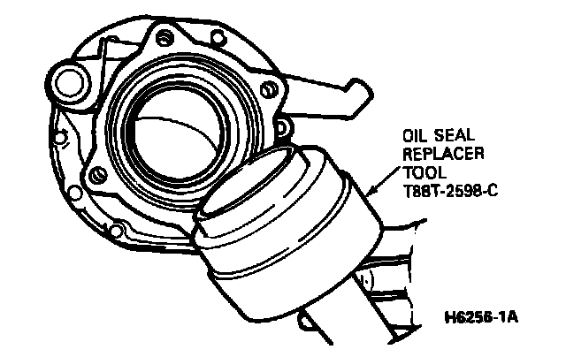 4. Apply a light coating of sealer to the outer edge of the outer oil seal. Position the oil seal in the bore of the case with the sealing lip facing inward. Press the seal into the bore of the case using Seal Replacer T88T-2598-C or equivalent. Press the seal in flush with the bore surface.