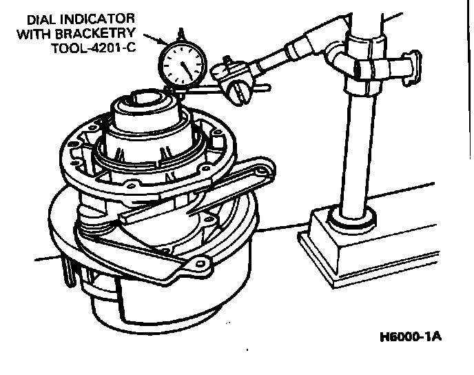 19. Mount a dial indicator between the mainshaft and the case to check end play. Use dial indicator with bracketry TOOL-4201-C or equivalent.