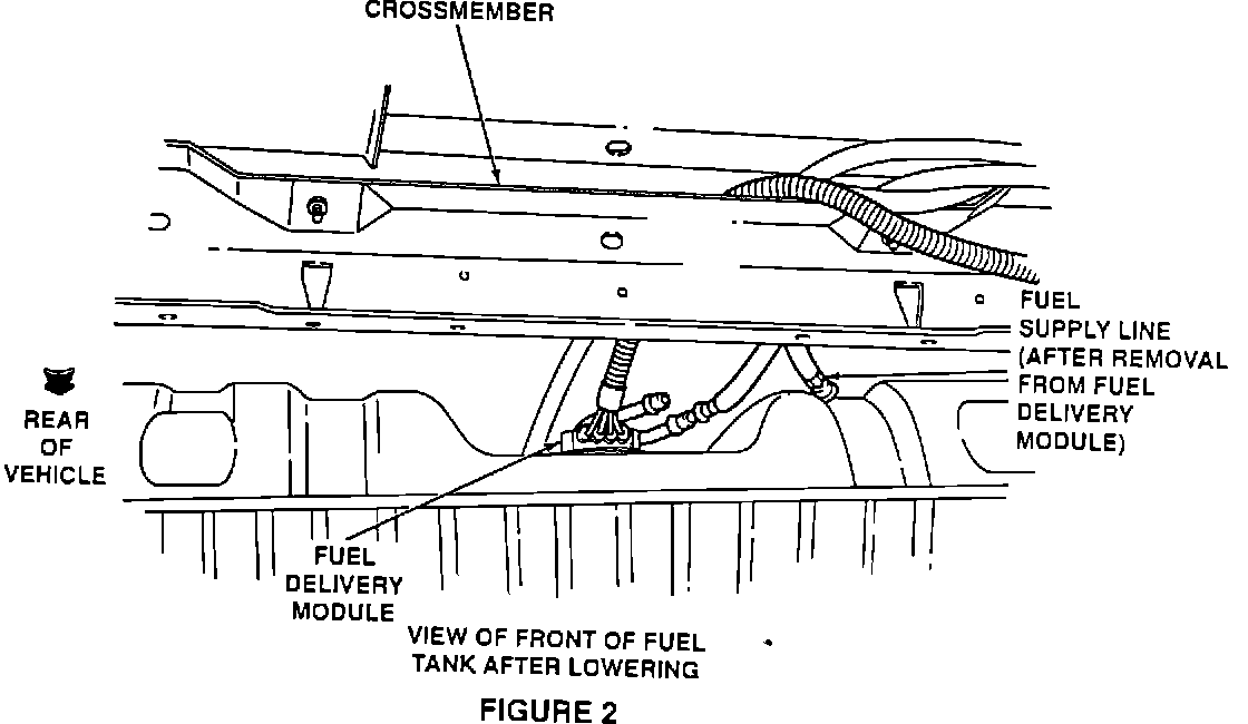 6. SUPPORT THE TANK AND REMOVE THE BOLTS ATTACHING THE TANK SUPPORTS TO THE FRAME. SLOWLY BEGIN TO LOWER THE TANK WHILE KEEPING THE FRONT OF THE TANK UP AS THE TANK IS LOWERED FROM THE REAR FIRST. SEE FIGURE # 1. MOVE THE TANK A FEW INCHES REARWARD AS THE TANK IS BEING LOWERED - BE SURE THAT THE FUEL LINES AT THE FRONT OF THE TANK ARE MOVING FREELY AND NOT BINDING ON THE CROSSMEMBER. DO NOT LOWER THE TANK MORE THAN 4-5 INCHES. THIS WILL PROVIDE ACCESS TO THE FUEL DELIVERY MODULE AT THE FRONT OF THE TANK. SEE FIGURE # 2. IF THE TANK IS LOWERED MORE THAN 4-5 INCHES, OR IF THE TANK IS LOWERED STRAIGHT DOWN WITHOUT ALSO MOVING IT A FEW INCHES REARWARD, THE FUEL DELIVERY MODULE PORTS COULD BE BENT.