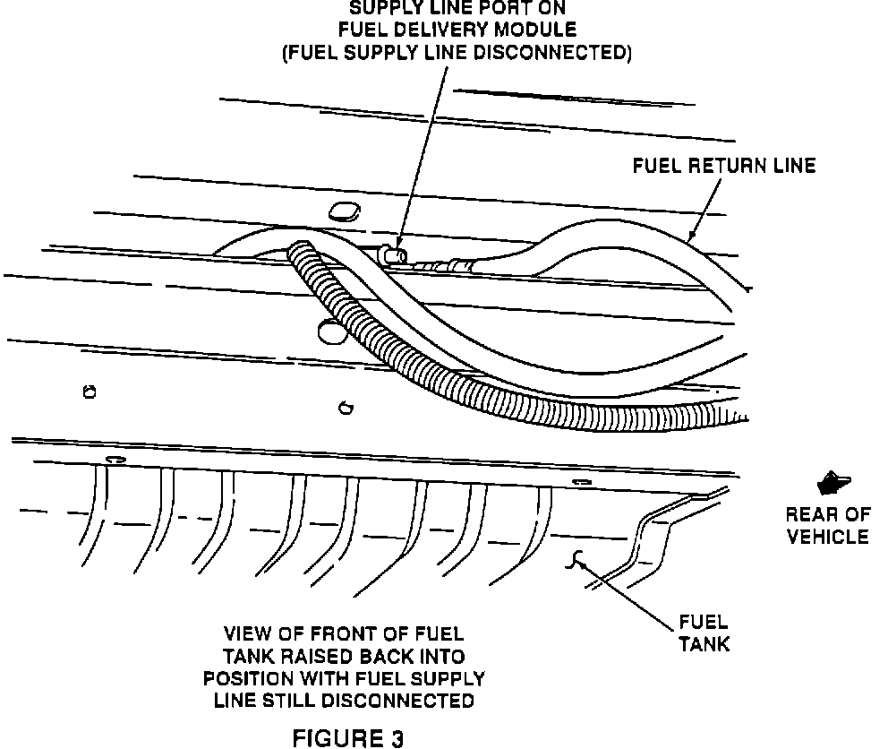 8. WITH THE FUEL SUPPLY LINE STILL DISCONNECTED, CAREFULLY MOVE THE FUEL TANK BACK INTO POSITION BY LIFTING THE FRONT OF THE TANK FIRST. BE CAREFUL NOT TO KINK THE FUEL LINES AT THE FRONT OF THE TANK. SEE FIGURE # 3. POSITION FUEL TANK SUPPORTS AND INSTALL ATTACHING BOLTS AND NUTS. TIGHTEN TO 37-50 N-m (27-37 FT.LB.). FOR ADDITIONAL INFORMATION, SEE TSB 91-23-10.