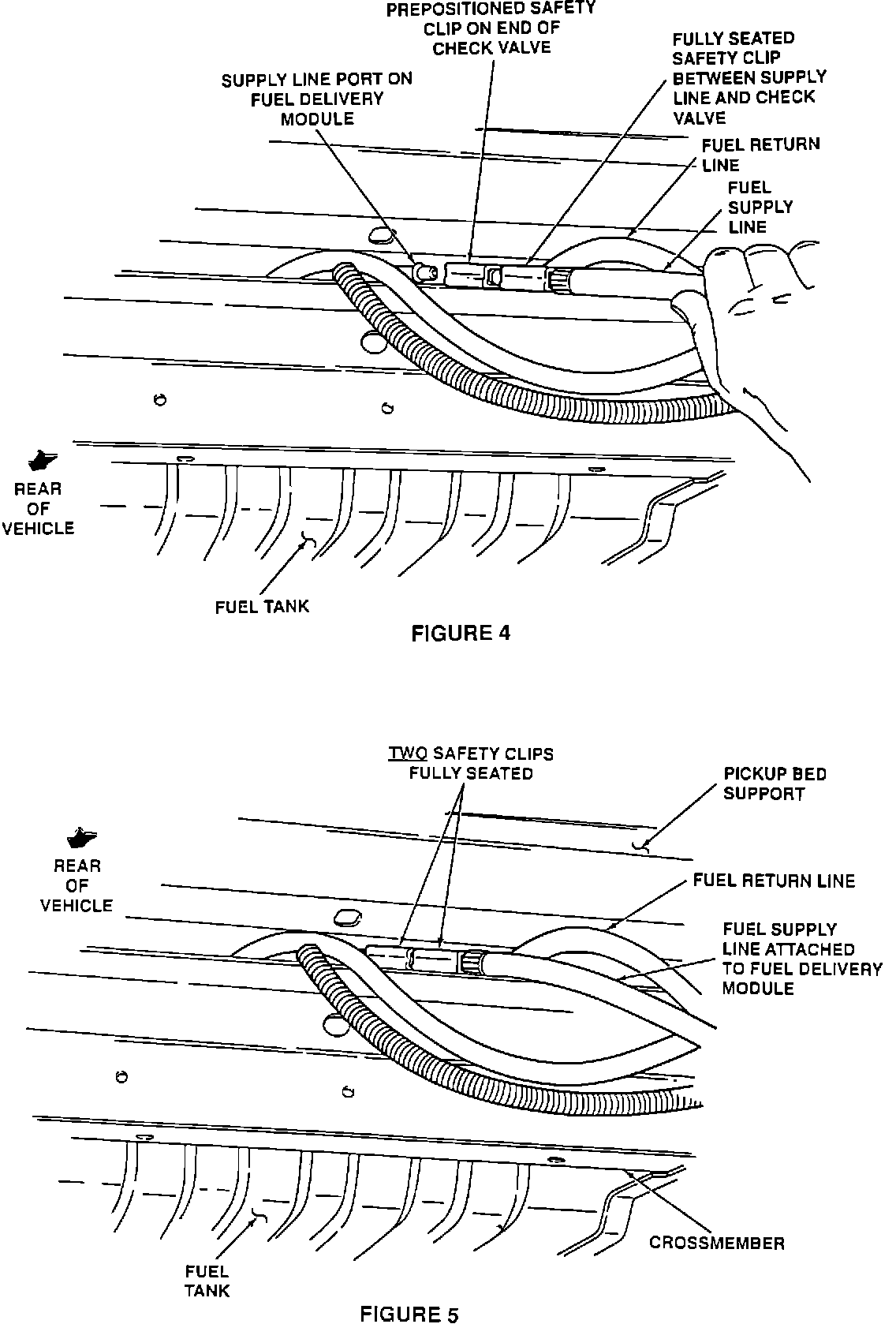12. CONNECT THE FUEL SUPPLY LINE AND CHECK VALVE CONNECTOR ASSEMBLY (WITH SAFETY CLIP PRE-POSITIONED) TO THE FUEL DELIVERY MODULE BY INSERTING THROUGH THE SPACE BETWEEN THE FRAME CROSSMEMBER AND THE PICKUP BOX BED SUPPORT. SEE FIGURE # 4 AND # 5 BELOW. DO NOT ATTACH UNTIL A SAFETY CLIP IS PRE-POSITIONED ON THE OPEN END OF THE CHECK VALVE CONNECTOR AND THE OTHER SAFETY CLIP IS ATTACHED BETWEEN THE CHECK VALVE AND THE FUEL SUPPLY LINE. (REFERENCE APPENDIX I OF INSTRUCTION SHEET 8117 OR 8118 IN KIT CC OR DD FOR INSTALLATION PROCEDURE). AFTER THE FUEL LINE AND CHECK VALVE CONNECTOR ARE ATTACHED TO THE FUEL DELIVERY MODULE, USE A LARGE FLAT BLADE SCREWDRIVER TO FULLY SEAT THE SAFETY CLIP ONTO THE SUPPLY LINE OF THE FUEL DELIVERY MODULE AND THE CHECK VALVE. MAKE SURE TO POSITION THE SAFETY CLIP SO THE LEGS OF THE CLIP WILL BE HORIZONTAL TO THE GROUND WHEN ATTACHED TO THE FUEL DELIVERY MODULE. BOTH SAFETY CLIPS MUST BE INSTALLED.
