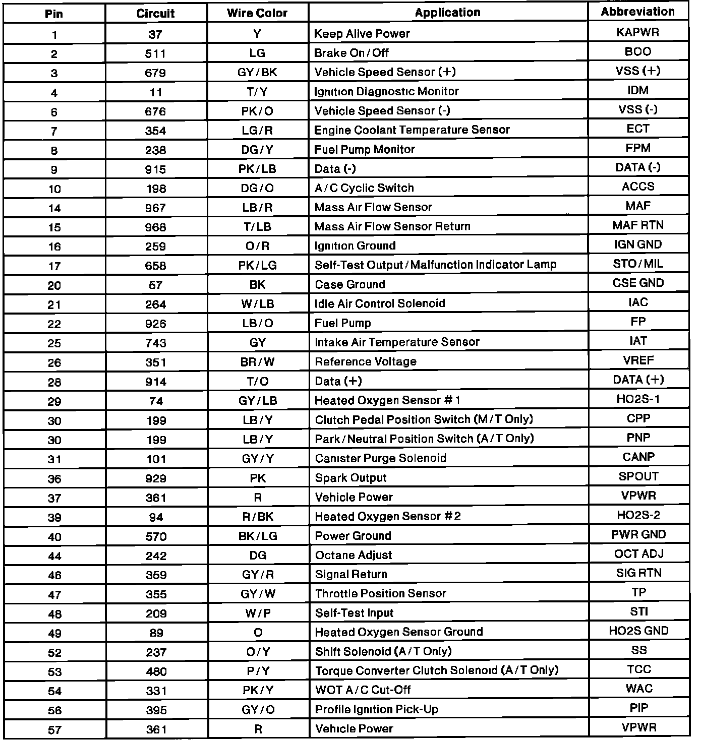 Powertrain Control Module (PCM) Connector Pin Useage: